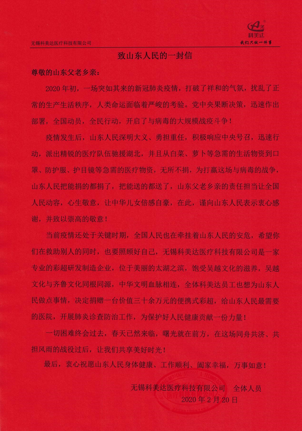 庚子年初,新冠肺炎疫情洶涌而來,隨著鐘南山院士馳援武漢指出新冠肺炎存在“人傳人”的現(xiàn)象,一場史無前例的疫情攻堅戰(zhàn)在全國打響。武漢告急,全國馳援,從生活物資到醫(yī)療用品源源不斷往最需要的地方,山東人民搬家式的支援抗疫模式更是感動了全國人民,彩超作為新冠肺炎病情診斷的重要手段,得到臨床專家的重視,為緩解疫情防控期間醫(yī)療物資緊缺狀況,有效防范醫(yī)護人員感染和疫情擴散風(fēng)險,科美達(dá)公司主動聯(lián)系山東省慈善機構(gòu),向濟南市鋼城區(qū)慈善總會定向捐贈了價值38萬元的便攜式彩超設(shè)備,用于濟南市鋼城區(qū)醫(yī)院抗擊肺炎疫情和人民健康檢查,確保戰(zhàn)略后方穩(wěn)固。